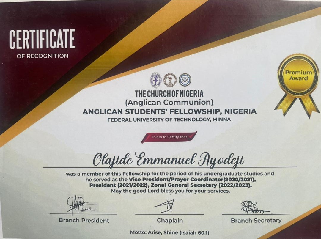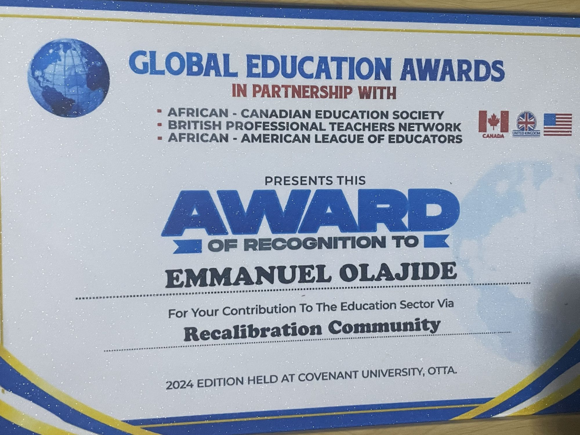 Founded Recalibration Community on March 2, 2024, after graduating as one of the top three in my department. Launched with an educational event titled “Recalibration: Maximizing Your Undergraduate Years for All-Round Excellence”, with 88 participants from 5 Nigerian states and 5 invited speakers.