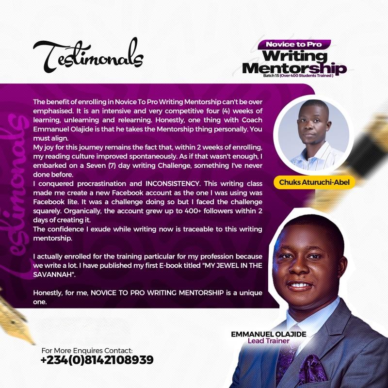 I also serve as the Lead Trainer of the Novice to Pro Writing Mentorship, where I guide writers step-by-step from beginner level to confident, published authors.