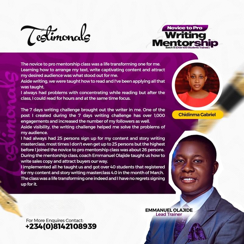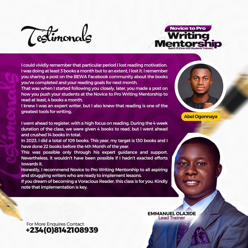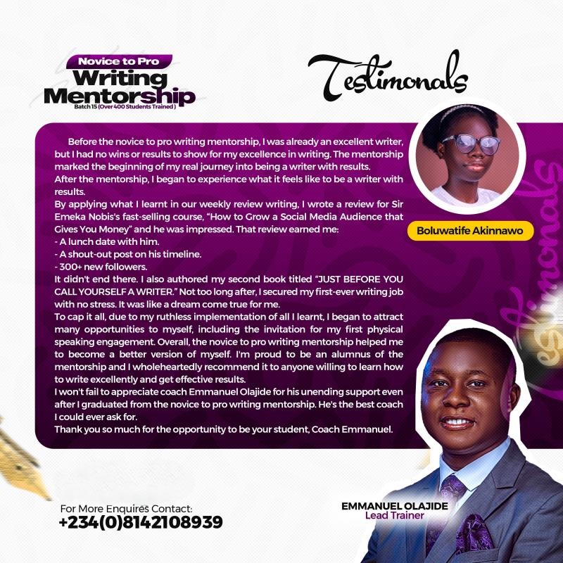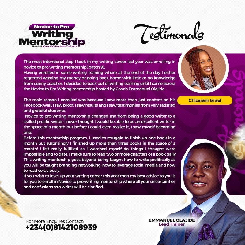 I also serve as the Lead Trainer of the Novice to Pro Writing Mentorship, where I guide writers step-by-step from beginner level to confident, published authors.